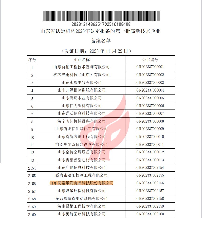 近日,全國高新技術(shù)企業(yè)認定管理工作領(lǐng)導小組辦公室公示了山東省認定機構(gòu)2023年認定報備的第一批高新技術(shù)企業(yè)名單,山東同泰維潤食品科技股份有限公司再次通過認定,被授予“國家高新技術(shù)企業(yè)”稱號。